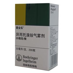 | 不良反应: | 在临床试验中最常见的非呼吸道的不良事件是头痛、恶心和口干。 由于爱全乐(Atrovent)全身吸收很少,其抗胆碱能副作用如心率增加和心悸、眼部调节障碍、胃肠道蠕动紊乱、尿潴留是很少见的,并且是可逆性的,但对已有尿道梗阻的患者来讲可能增加其尿潴留的危险性。 | ||||